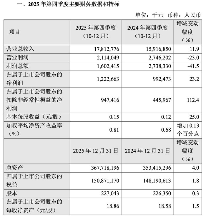 财报显示,2025年第四季度,公司实现营业收入178.13亿元,同比增长11.9%;毛利为30.96亿元,毛利率为17.4%;归属于上市公司股东的净利润12.23亿元,同比增长23.2%。扣非净利润为9.47亿元,增长了112.4%。