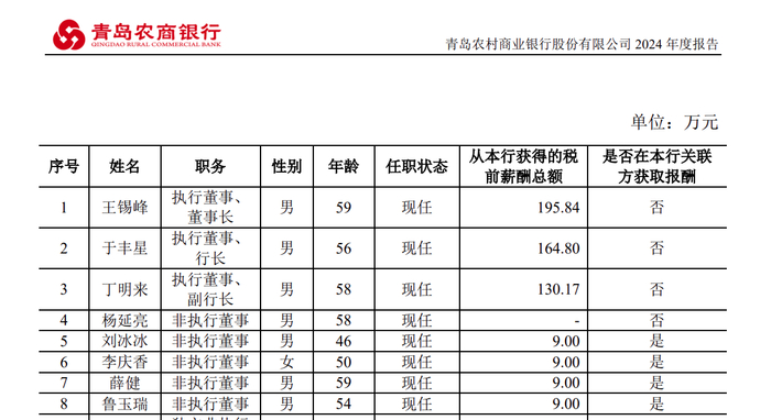 在金融业普遍推行“限薪令”的行业背景下,据该行相关年报数据,2023年及2024年,王锡峰分别以187.26万元、195.84万元的税前年薪,连续两年蝉联A股上市农商行董事长薪酬榜首。