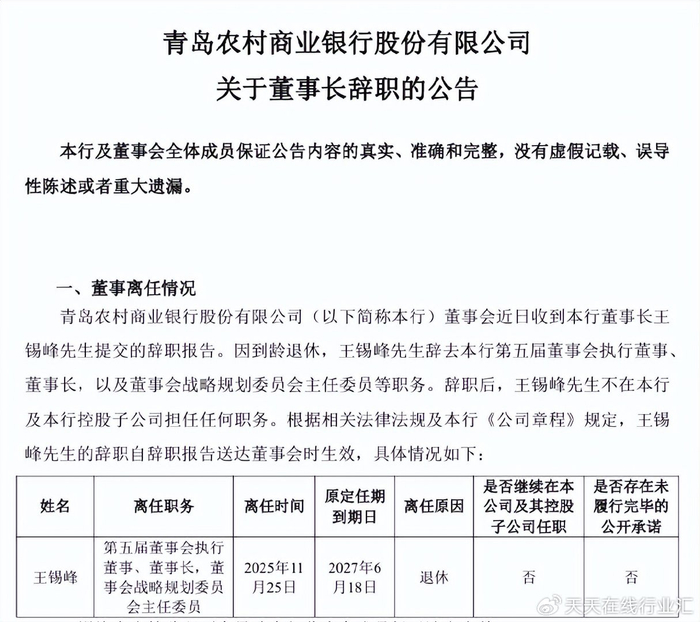 公开简历显示,王锡峰现已满足60岁退休年龄,并未延长任期。青农商行在公告中对王锡峰作出了积极的评价,并对其在任职期间做出的贡献表示感谢。公告显示其正式离任日期为2025年11月25日,其原定任期本应至2027年6月18日,辞职后不在该行及该行控股子公司担任任何职务。