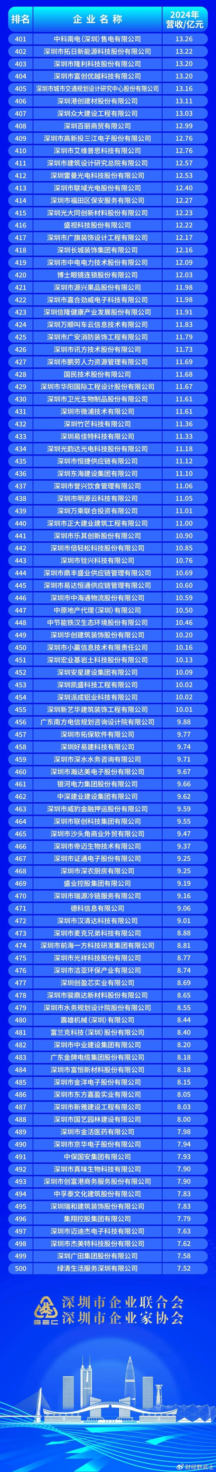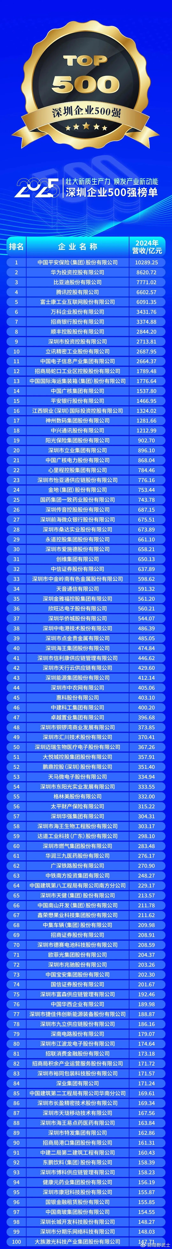 日前,深圳市企业联合会、深圳市企业家协会(简称深圳企联)正式发布“2025深圳企业500强榜单”及《2025深圳500强企业发展报告》。中国平安保险(集团)股份有限公司、华为投资控股有限公司、比亚迪股份有限公司位列“2025深圳企业500强榜单”前三名。