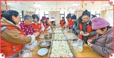 江西省宜春市万载县马步乡,志愿者在敬老院和老人一起包饺子。 周 亮摄(影像中国)