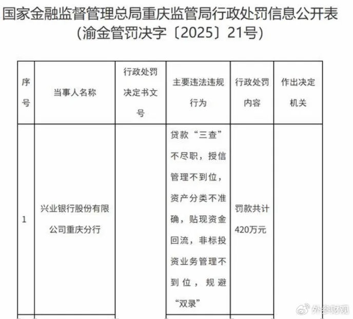 其次,便是文章开头提到的合规管理旧疾。在2025年10月,重庆银行因贷款“三查”不尽职等问题被处以402万元的巨额罚单。