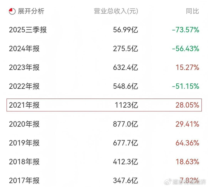 在营收上则走出了一条相反的轨迹。2021年金科首次突破千亿,隔年便出现腰斩。净利润也在2022年扭亏为盈,当年巨亏213亿元。当年底,因为一笔3.25亿美元债券违约,金科债务危机公开化。