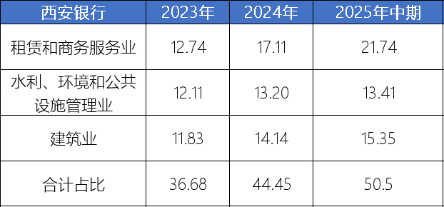 从行业分布看,其信贷资源呈现出高度的集中性。西安银行长期对接省内重大基建项目,其建筑业客户多为地方国企。历年财报显示,“租赁和商务服务业”、“水利、环境和公共设施管理业”与“建筑业”始终是其前三大贷款行业,2025年上半年前三行业的贷款增量占据了全行的98%。由此可以推断,其三季度的对公贷款,依然主要流向了上述政信类领域。
