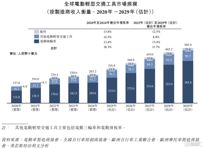 市场规模方面,据弗若斯特沙利文的数据,2024年全球电动轻型交通工具制造商总收入为2632亿元,预计到2029年将达到5059亿元,2025年至2029年的复合年增长率预计约11.7%,低于2020年至2024年18.3%的复合年增长率。