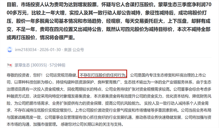 1月28日,蒙草生态连回2条提问,其中均写道:“公司定增工作仍在持续推进中,由于本次定增涉及项目较多,需要查验核实的工作较多,公司和各中介机构正全力配合积极推动该项工作进展。”