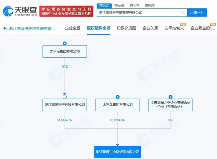 该公司成立于2016年6月,法定代表人为李军,经营范围包括供应链管理服务、货物进出口、技术进出口、进出口代理等,现由太平鸟集团有限公司、浙江鹏源物产控股有限公司及上述新增股东共同持股。