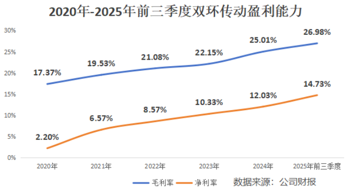 毛利率从2020年的17.37%,一路攀升至2025年前三季度的26.98%。净利率进步更为惊人,从2020年仅有的2.20%,飙升至2025年前三季度的14.73%。