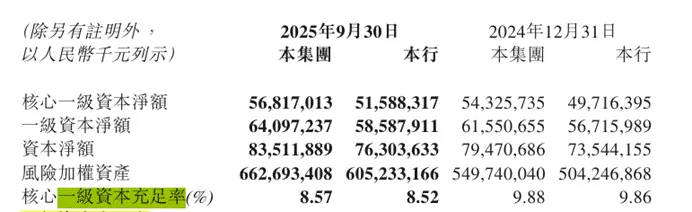然而,在规模与业绩高增长的背后,银行的资本充足水平明显承压。根据财报显示,截至三季度末,一级资本充足率和资本充足率也分别下滑至9.67%和12.60%。规模的快速扩张消耗了大量资本,安全垫逐渐变薄。如何平衡增长与资本补充、守住风险底线,成为重庆银行迈向高质量发展阶段必须回答的关键课题。
