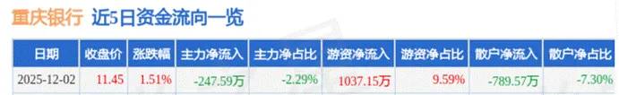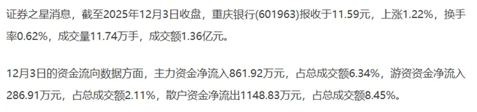 12月3日,根据证券之星来源,重庆银行股价收涨1.22%,表现强势。然而,同日的资金流向数据却描绘了另一幅图景:主力资金净流出超过800万元。这种价涨资退的鲜明背离,如同一场热闹宴会中,几位最重要的客人却悄然离席,为这份万亿城商行的喜报蒙上了一层疑云。