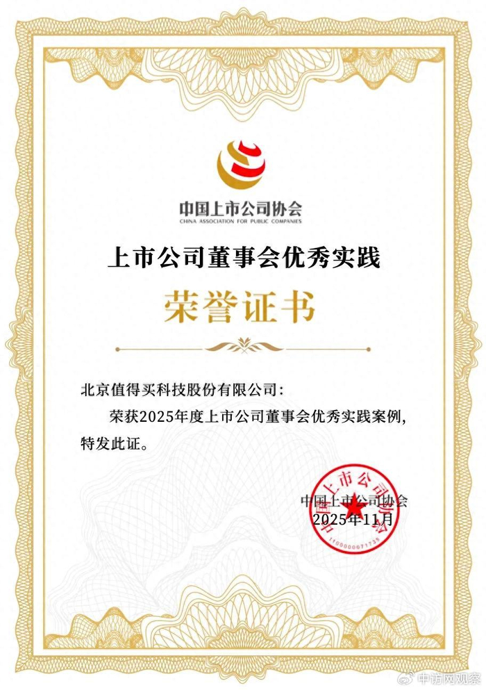 近日,中国上市公司协会正式揭晓“2025上市公司董事会最佳实践案例征集活动”评选结果。值得买科技凭借高质量的合规运作、治理效能及战略决策能力,成功入选“2025上市公司董事会优秀实践案例”,这已是公司连续三年蝉联此项荣誉。
