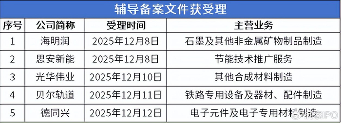 12月8日-12月14日,北交所有5家公司辅导备案文件获受理,进入辅导期。