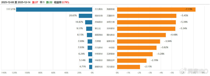 上周(12月8日-12月14日),北证50指数周涨2.79%至1447.69点。北证50成分股中,30只上涨,1只平盘,19只下跌。