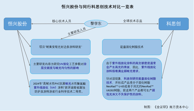 此外,恒兴股份的“高耐水性PVC抗菌哑光水性聚氨酯紫外线固化(UV)涂料”、“耐黄变哑光封边条涂料研发”项目、“橡胶增强骨架材料用无甲醛水性粘合剂”项目及“应用于轮胎帘子布粘结的水性封闭异氰酸酯的研制”项目,与黎学东“前东家”科思创技术所涉及的技术领域或高度相似。
