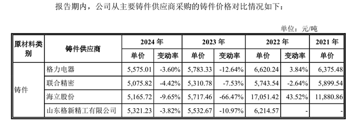 据2025年4月23日首轮问询回复,2021-2024年,南特科技向联合精密采购铸件单价分别为5,899.54元/吨、5,743.54元/吨、5,310.78元/吨、5,075.82元/吨。