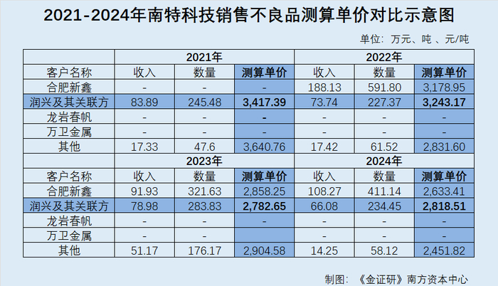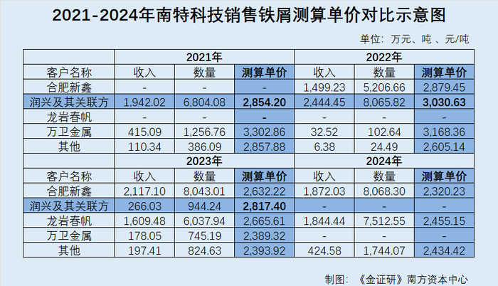 其中,经测算,2021-2023年,南特科技向润兴及其关联方的销售铁屑的销售单价或分别为2,854.20万元、3,030.63万元、2,817.4万元;2021-2024年,向润兴及其关联方的销售不良品的销售单价或分别为3,417.39万元、3,243.17万元、2,782.65万元、2,818.51万元。