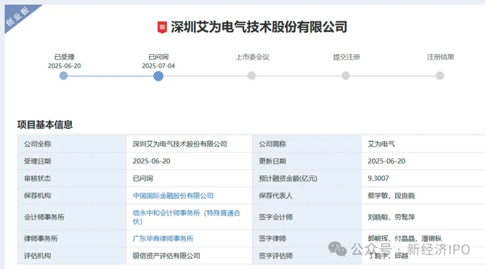 根据公开资料,艾为电气主要从事新能源汽车热管理高压控制器 产品的研发、销售,初步构建了由热管理高压控制器和充电模块组成的产品矩阵,目前已成为国内最大的新能源汽车热管理高压控制器第三方。2025年6月30日,艾为电气创业板IPO获得受理,保荐机构为中金公司,会计师事务所已经变更为为信永中和会计师事务所(特殊普通合伙)。