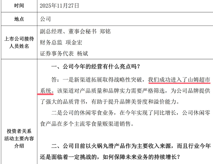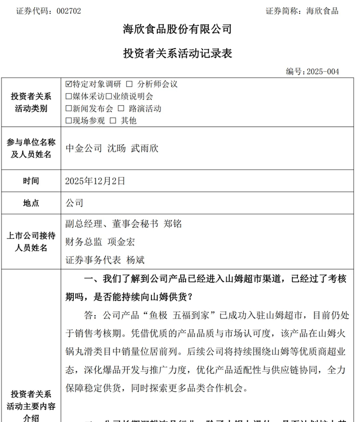 海欣食品11月27日披露的投资者关系活动记录表显示,公司产品已入驻山姆超市这一高端渠道,为品牌提供强大品质背书,有助于提升品牌美誉度和溢价能力。