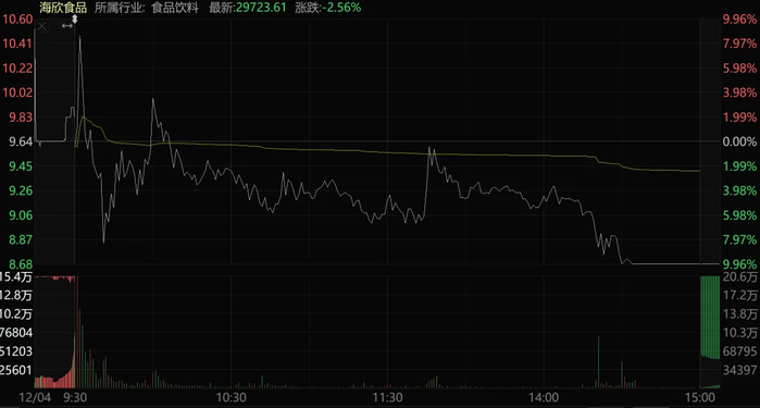12月4日,海欣食品开盘后快速拉升暴涨近9%,随后迅速转跌,并在下午封死跌停板。