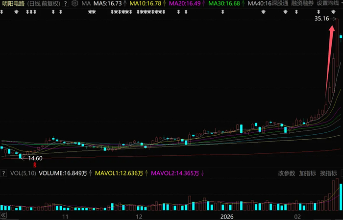跟PCB三巨头相比,近期最牛的PCB公司似乎是明阳电路,其股价2月24日-26日分别暴涨11.2%、17.06%、20%,三天累计涨幅超过56%。