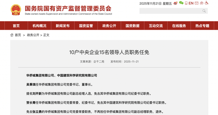 乐居财经 刘治颖 11月21日,国务院国资委网站发布《10户中央企业15名领导人员职务任免》。