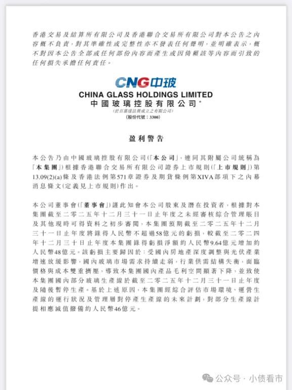 3月16日,中国玻璃(03300.HK)公告称,集团预期截至2025年12月31日止年度将录得不超过58亿元的亏损,较2024年亏损净额增加约48亿元。