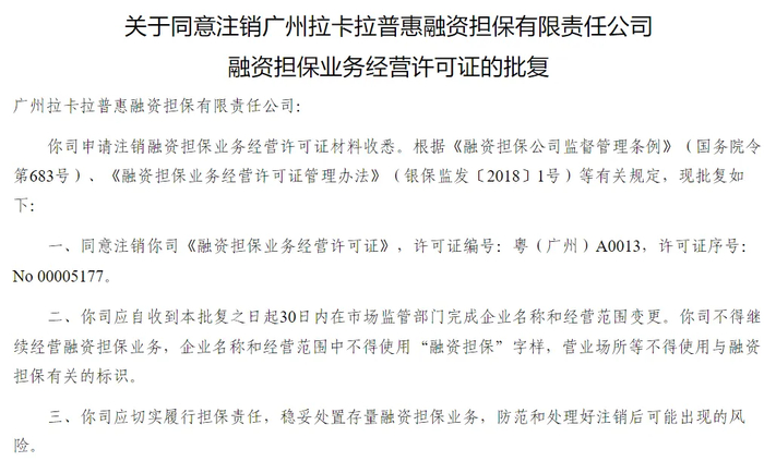 近日,广州地方金融管理局发布公告,同意广州拉卡拉普惠融资担保有限责任公司(下称拉卡拉融担)注销融资担保业务经营许可。