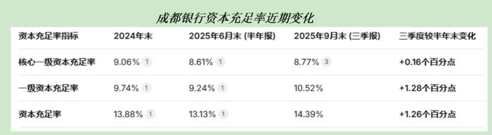 根据国家金融监督管理总局的规定,非系统重要性银行的核心一级资本充足率最低要求为7.5%。成都银行三季报8.77%的水平目前看是达标的。之所以被认为“偏低”,主要是因为在2024年末至2025年上半年期间,成都银行该指标经历了持续的下滑,导致安全垫变薄,引起了市场和监管对于其未来扩张能力和风险抵御能力的关注。