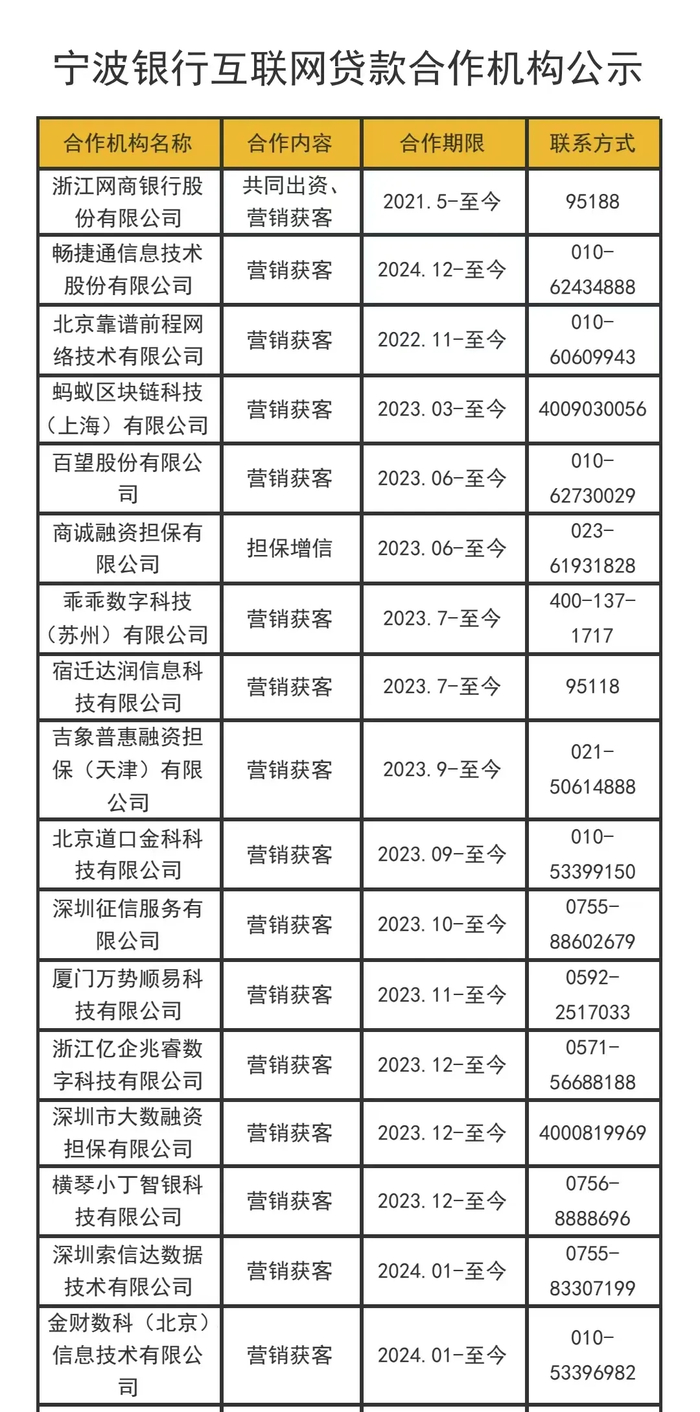 宁波银行披露的互联网贷款合作机构名单显示,该行共与122家机构合作互联网贷款业务,具体包括:网商银行、畅捷通、办公逸、乖乖数科、道口金科、粤财征信、顺丰科技、中移金科、吉象普惠(中国太平旗下)、找钢网、财付通小贷、唯品会、众安在线、钉钉、爱奇艺、中国银联、比亚迪汽车、华为、淘宝闪购、转转等。