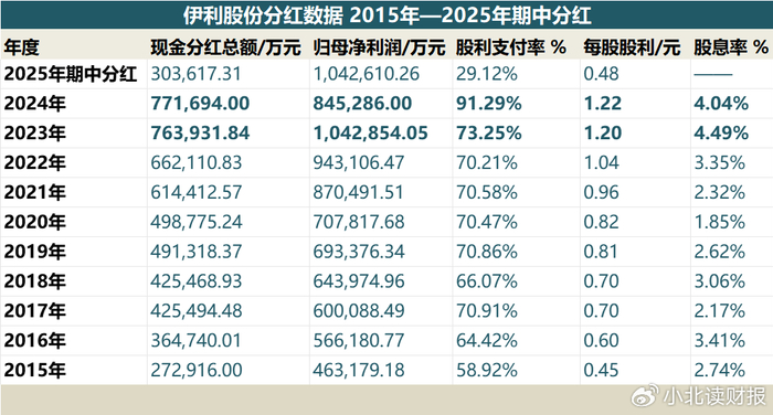 2025-2027年度,公司每年度现金分红总额占当年归母净利润的比例不低于75%,且每股派发现金红利金额不低于2024年度每股派发现金红利1.22元(含税)。与此同时,今年三季报发布同期,伊利公布了中期分红预案,拟派发现金红利30.36亿元;如下表所示,2024年伊利的股息率达到了4.04%,分红比例达到了91.29%。