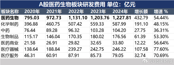 从A股医药板块上市公司的研发投入看,2022—2024年间,医药生物板块的研发费用增速为54.44%,发映出在政策鼓励创新之下,药企在研发端持续发力。