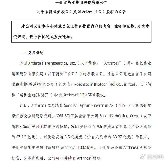 12月14日,一品红发布公告称,公司参股公司Arthrosi 100%股权拟被出售,Sobi美国公司拟以9.5亿美元首付款(折合人民币约67.13亿元)以及最高达5.5亿美元(折合人民币约38.87亿元)的临床、注册和销售里程碑付款收购Arthrosi。