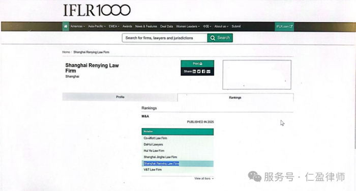 仁盈律所凭借卓越的业务表现和高度的客户信赖,在上海地区的“兼并收购”领域获得推荐。
