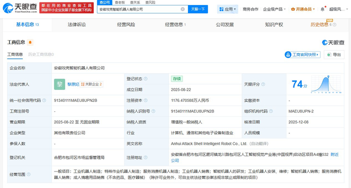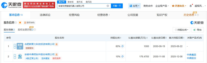 该公司成立于2025年8月,法定代表人为黎原妃,经营范围包括工业机器人制造、特殊作业机器人制造、服务消费机器人制造等,现由合肥新聚力科技投资有限公司、中鼎股份(000887)共同持股。