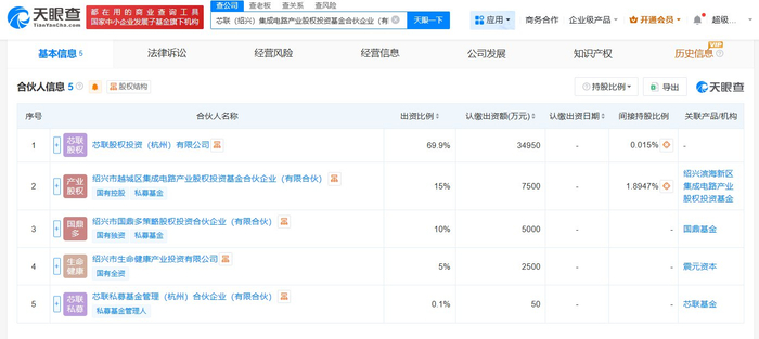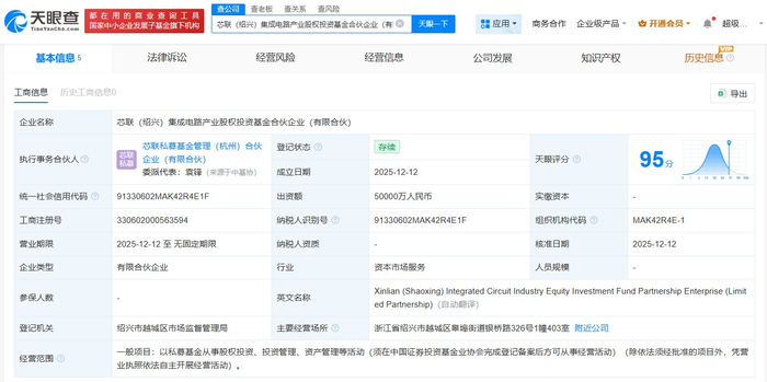 雷达财经讯,天眼查App显示,近日,芯联(绍兴)集成电路产业股权投资基金合伙企业(有限合伙)成立,执行事务合伙人为芯联私募基金管理(杭州)合伙企业(有限合伙),出资额5亿人民币,经营范围包括以私募基金从事股权投资、投资管理、资产管理等活动。合伙人信息显示,该基金由芯联集成旗下芯联股权投资(杭州)有限公司、绍兴市越城区集成电路产业股权投资基金合伙企业(有限合伙)、绍兴市国鼎多策略股权投资合伙企业(有限合伙)等共同出资。