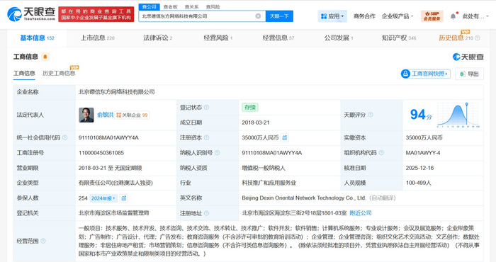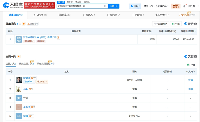 北京德信东方网络科技有限公司成立于2018年3月,注册资本3.5亿人民币,经营范围含软件开发、软件销售、计算机系统服务、专业设计服务、会议及展览服务、教育咨询服务、企业管理、组织文化艺术交流活动等。股东信息显示,该公司由新东方迅程科技(香港)有限公司全资持股。值得一提的是,此前,孙东旭已卸任东方甄选(北京)科技有限公司职务。