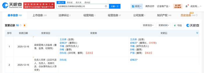 雷达财经讯,天眼查工商信息显示,近日,北京德信东方网络科技有限公司发生工商变更,孙东旭卸任法定代表人、总经理、董事,由俞敏洪接任法定代表人、总经理,新增尹强为董事。