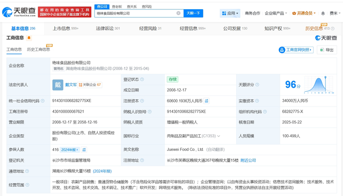 天眼查App显示,绝味食品股份有限公司成立于2008年12月,法定代表人为戴文军,注册资本约6.1亿人民币,经营范围包括农副产品销售、普通货物仓储服务、企业管理咨询等,由上海聚成企业发展合伙企业(有限合伙)、上海慧功企业发展合伙企业(有限合伙)、上海成广企业发展合伙企业(有限合伙)等共同持股。对外投资信息显示,该公司对外投资30余家企业,其中20余家处于存续状态,包括广东阿华食品有限责任公司、深圳网聚投资有限责任公司等,其他10余家企业已注销。