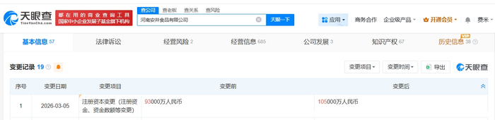 雷达财经讯,天眼查App显示,近日,河南安井食品有限公司发生工商变更,注册资本由9.3亿人民币增至10.5亿人民币,增幅约13%。