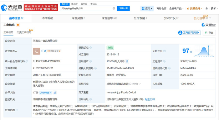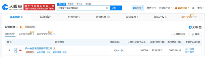 河南安井食品有限公司成立于2018年10月,法定代表人为江猛,经营范围包括速冻食品制造、肉制品及副产品加工、水产品及制品加工等。股东信息显示,该公司由安井食品(603345)全资持股。