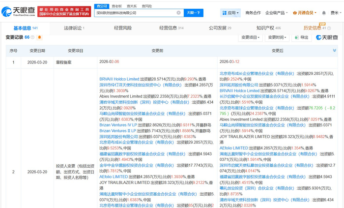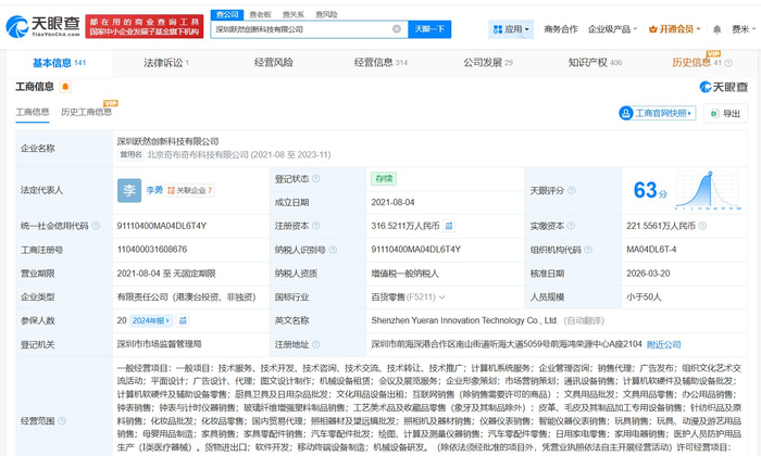 深圳跃然创新科技有限公司成立于2021年8月,法定代表人为李勇,经营范围含玩具销售、软件开发、移动终端设备制造等。股东信息显示,该公司现由北京奇布星球企业管理合伙企业(有限合伙)、北京奇布成长企业管理合伙企业(有限合伙)及上述新增股东等共同持股。官网显示,该公司是一家致力于打造全新游戏体验的玩具公司。
