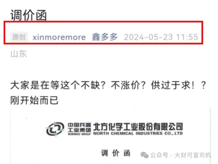 而他的“收割套路”早有前科,2024年就曾因伪造涉军企业涨价函被抓现形。当时,他先是在自己的微信公众号“鑫多多”上发布北化股份的调价函文章,接着又用“天道酬勤我午休”的雪球账号同步转发这篇小作文。