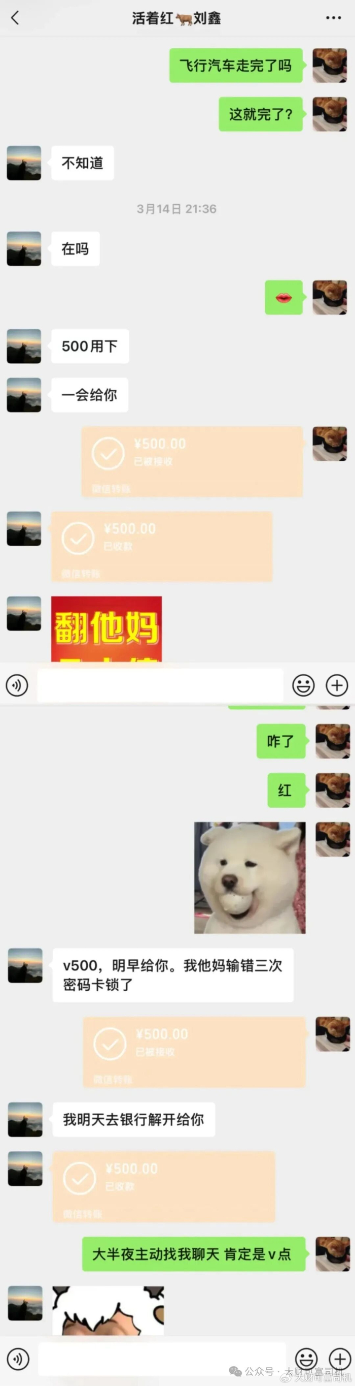 随着热度升高,藏在背后的旧闻也就被扒得越彻底,剧情反转堪称魔幻。一张流传甚广的微信转账截图显示,这位如今身家十亿的大佬,曾在半夜急着找别人借500块,还特意解释“密码输错三次卡锁了,明早就还”,结果这500块钱最终石沉大海。