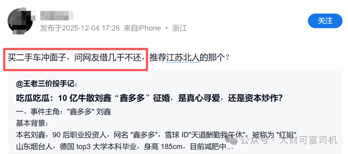 月初,司机刚写了《10亿身家游资自曝“恋爱脑”!》,这位名叫鑫多多(本名刘鑫)的90后十亿游资,凭一篇征婚文直接出圈,评论区被“恋爱脑大佬”的调侃刷满屏,还有网友扒出他185cm身高搭配幻影库里南的奢华配置。