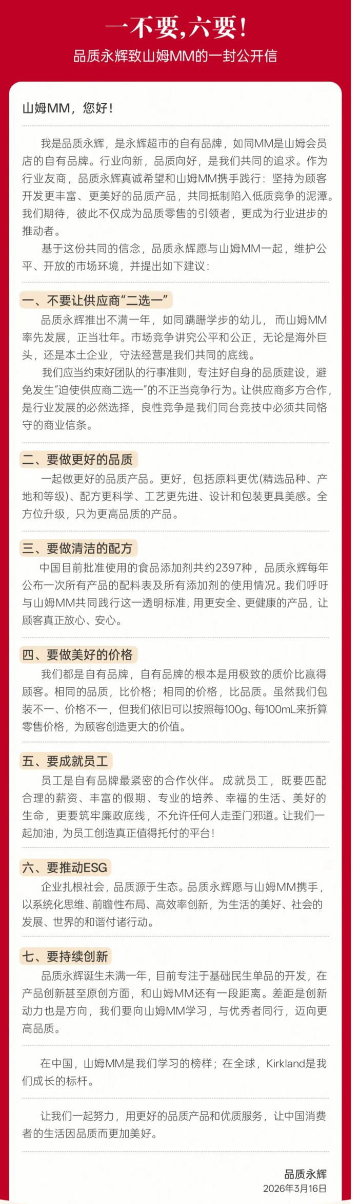 公开信中提到,品质永辉推出不满一年,如同蹒跚学步的幼儿,而山姆MM率先发展,正当壮年。品质永辉和山姆MM应当约束好团队的行事准则,专注好自身的品质建设,避免发生“迫使供应商二选一”的不正当竞争行为。同时呼吁山姆MM共同践行每年公布一次所有产品配料表及所有添加剂使用情况的透明标准。
