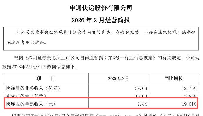 需要注意的是,根据多家快递公司此前公布的经营简报,行业单票收入呈上涨态势。申通快递2月简报显示,2月快递服务单票收入同比增长19.61%至2.44元,受春节假期错期因素影响快递业务量同比下降5.85%,2月公司快递服务业务收入同比增长12.76%。