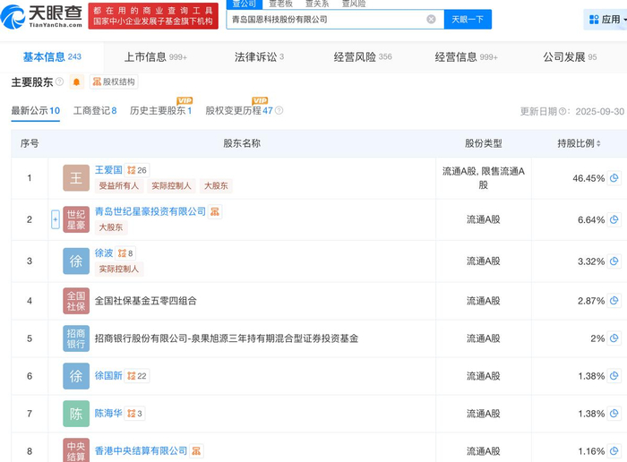天眼查App信息显示,国恩科技成立于2000年12月,位于青岛市城阳区。目前,该公司的注册资本约为2.7亿元,法定代表人为王爱国,主要股东包括王爱国、青岛世纪星豪投资有限公司等。