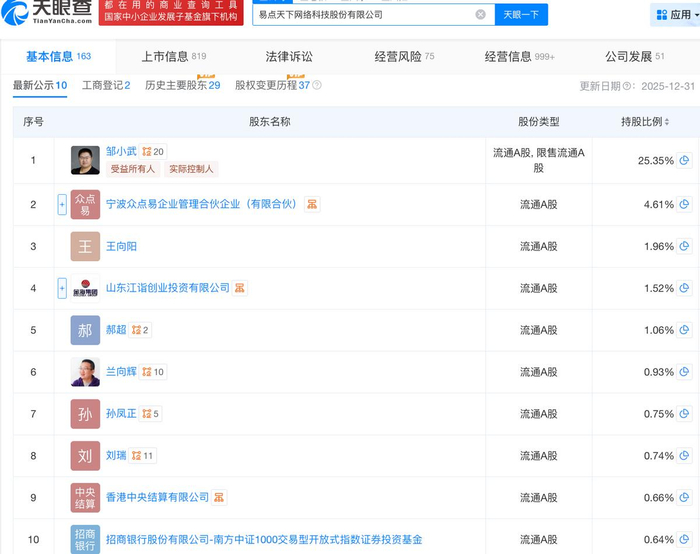 天眼查App信息显示,易点天下成立于2005年4月,前称为湖北高曼重工股份有限公司。目前,该公司的注册资本约为4.7亿元,法定代表人为邹小武,主要股东包括邹小武、王向阳等。
