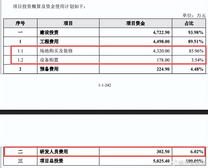 进一步来看,该项目投资重头是建设投资,金额高达4,722.90万元,占比93.98%,其中场地购买及装修高达4,320万元,占比85.96%,这样的投入比例与项目名称“研发及运营中心项目”是否匹配?