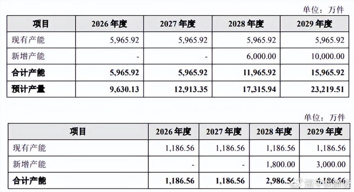 公司传感器2023年度投入量产,产量相对较低,现有产能为1,186.56万件,新增产能是现有产能的2.53倍,属于激进扩产。